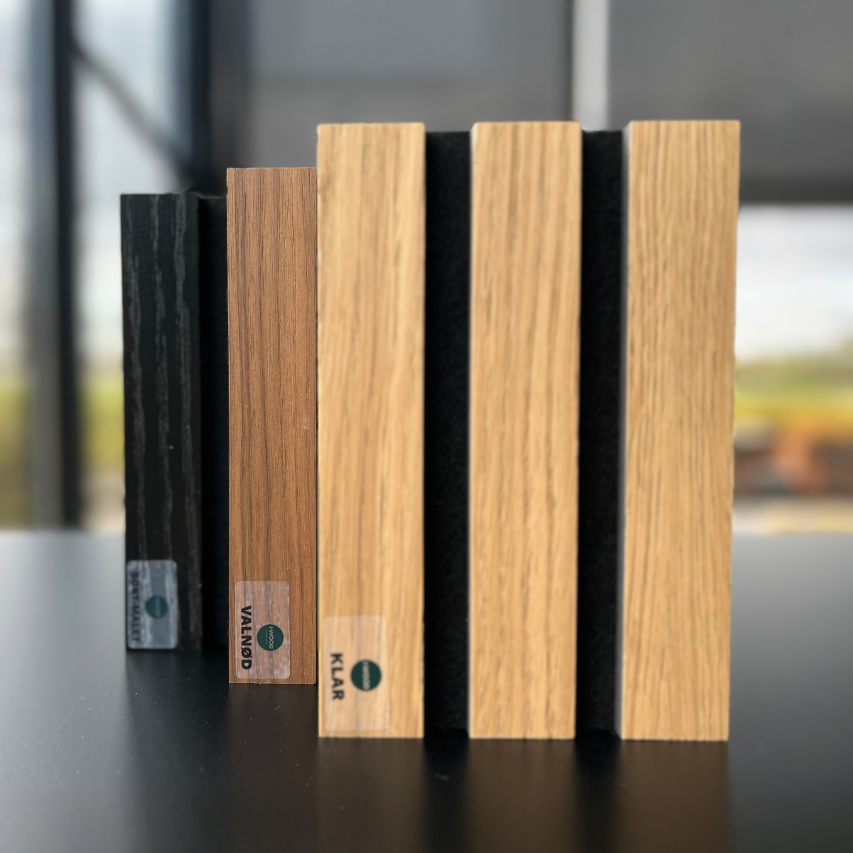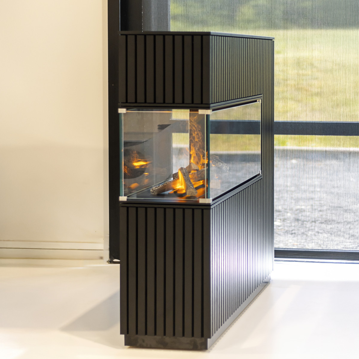 Decoflame - Lav frittstående biopeis med spiler i svartbeiset eik - panorama med tre glass og Hybrid Mist brenner