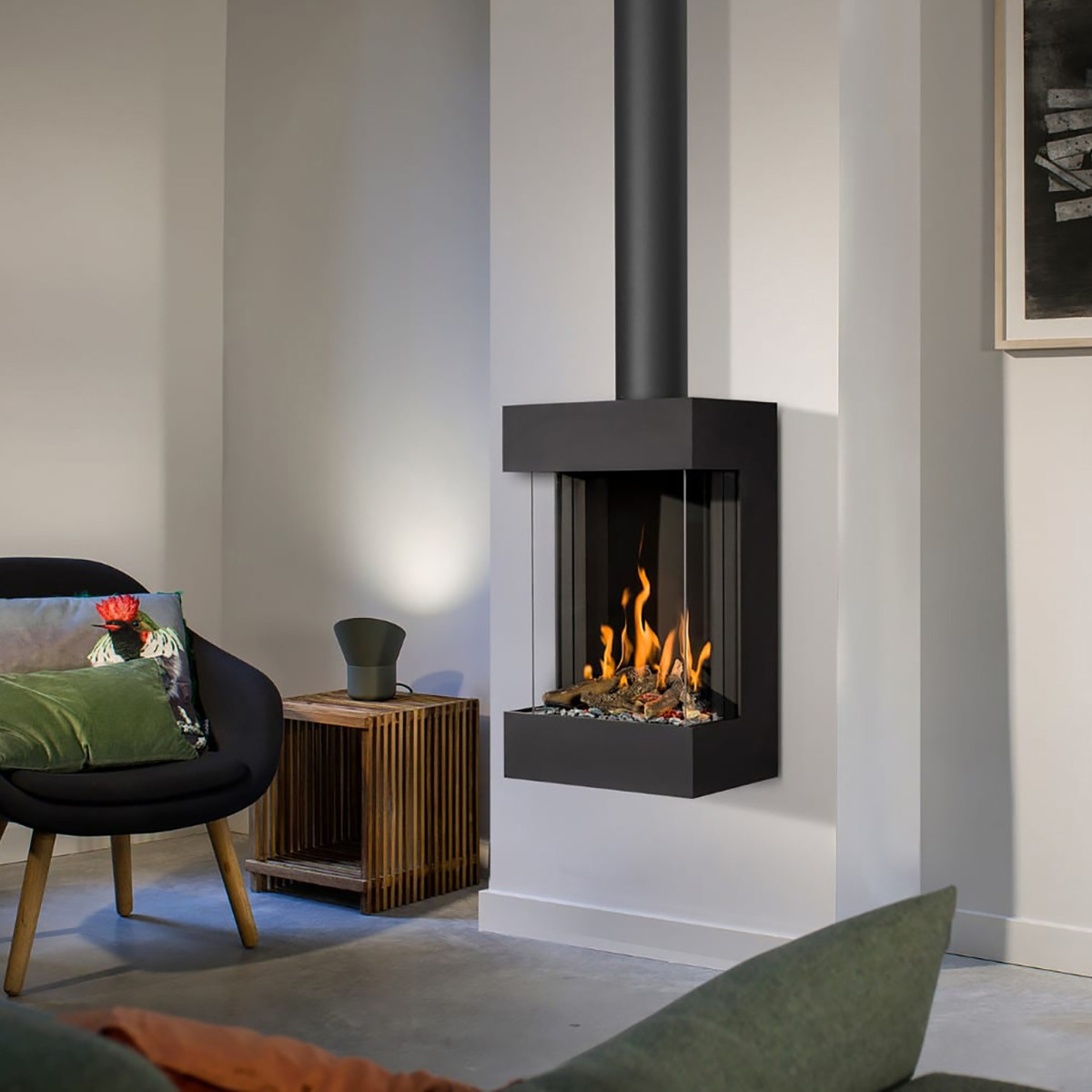 Box Gas Panorama kommer i tre ulike størrelser, en fleksibel peis som enten kan henges på vegg, plasseres på sokkel, eller stein/betong benk. Gasspeisen er en frittstående/hengende peis som ikke krever innebygging.
