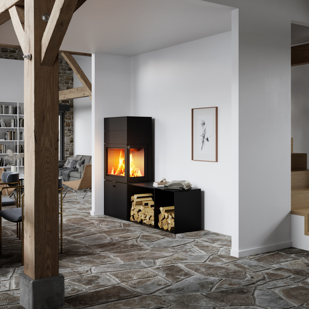 RAIS 600 får du nå også som frittstående modell – nemlig den nye 600 Max med innsyn til ilden fra tre sider. Et eksklusivt og elegant møbel i stålomramming med hele 4 mm platetykkelse. Under brendkammeret finnes en stor skuff, som kan benyttes til oppbevaring av ved eller annet. Skuffen åpnes med et elegant grep og lukkes lydløst (soft close). Du får også 600 Max med sidemøbler i to forskellige størrelser.