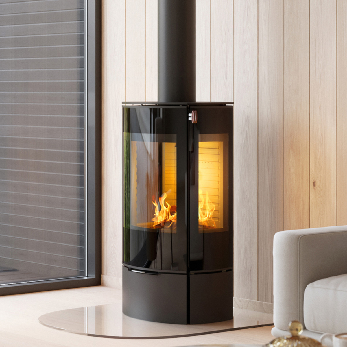 Denne flotte og funksjonelle ovnen har en elegant avrundet forside, skrå sider og tar ikke så mye plass. Caro 90 har en stor glassdør, slik at ilden fremtrer markant. Denne ovnen er ideell til både hjem, sommerhus eller hytte. Du har mulighet for å tilpasse ovnen til hjemmet ditt og din boligstil – velg selv farge, sideglass, håndtak og mye mer.