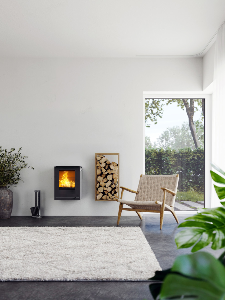 Liten, funksjonell og moderne vedovn for rom som krever et mindre varmebehov. Ovnen kan henges på vegg eller plasseres på gulv.
